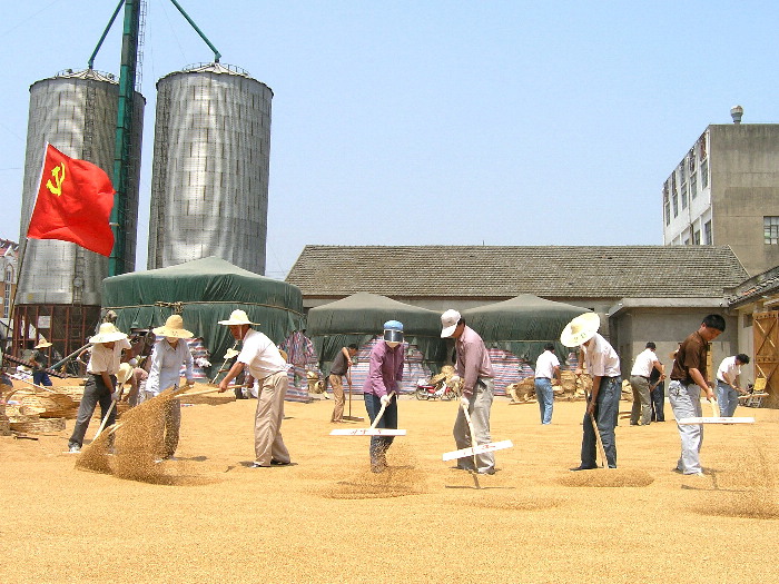 6月29日是星期天,这天上午,在明光市潘村湖农场种子公司和场属七个农业分场的晒场上,一面面鲜红的党旗在空中飘扬,来自医院、机关和各分场党支部的共产党员积极响应农场党委关于全场党员同志利用“七一”前的最后一个休息日参加“三夏”一线义务劳动的号召,为企业和职工群众奉献力量。参加义务劳动的同志顶着炎炎烈日下,或为缺少劳力的家庭农场翻晒小麦,或帮助种子加工企业转运粮食和检修机械设备,以实际行动彰显共产党员的风采,迎接建党87周年纪念日的到来。(杨登宏)