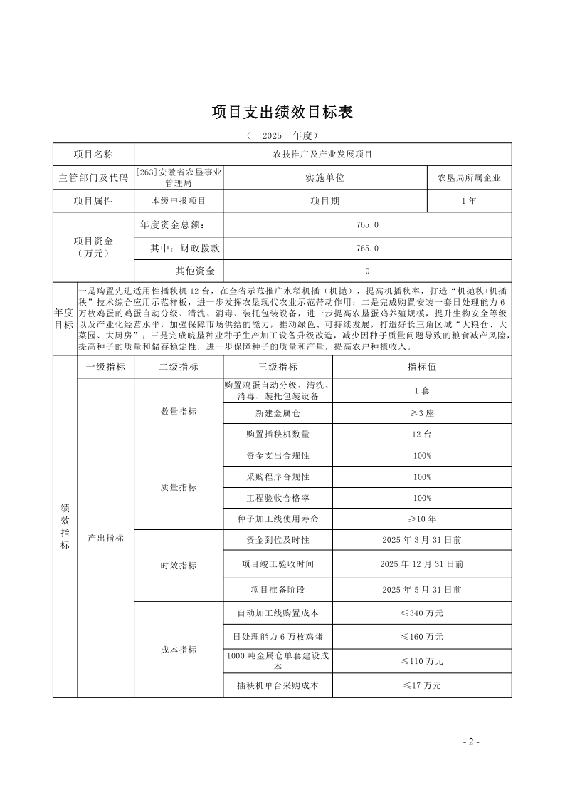 安徽省农垦事业管理局2025年度项目支出绩效目标