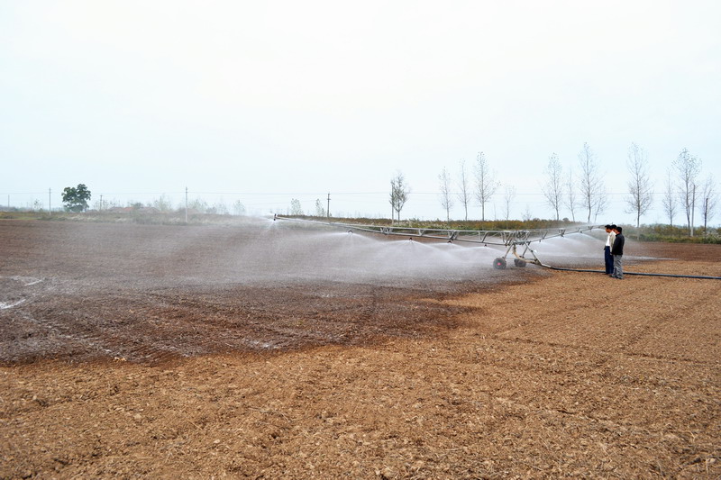 10月24日,安徽农垦潘村湖农场二分场的职工家庭农场正利用大型绞盘式喷灌机为麦田浇水。针对今年秋种以来出现的持续无雨天气,该农场的职工家庭农场利用各种灌溉设备为已播小麦的大田浇水,确保苗齐苗壮、安全越冬。(安徽日报2013年10月26日A2版,杨登宏摄)