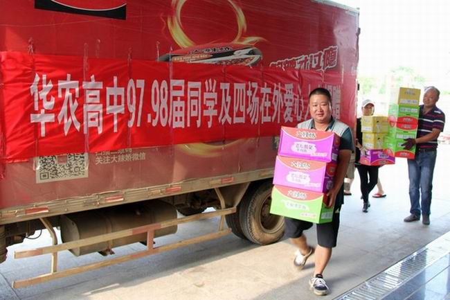 在四分场职工桂志洋发动下,华农高中97、98两届同学及四分场爱心人士,建立了名为“聚爱心,保家园”的微信群,在朋友圈相互转发,让更多人了解农场最新动态,不到两天时间就筹集善款1.6万元,购买200箱矿泉水、300箱方便面和价值3800元的防暑药品,送到了农场防汛办。安徽天溢建筑公司项目经理叶端喜得知家园遭受大灾后,慷慨捐款4万元。另有一些爱心人士还捐赠了3条船。