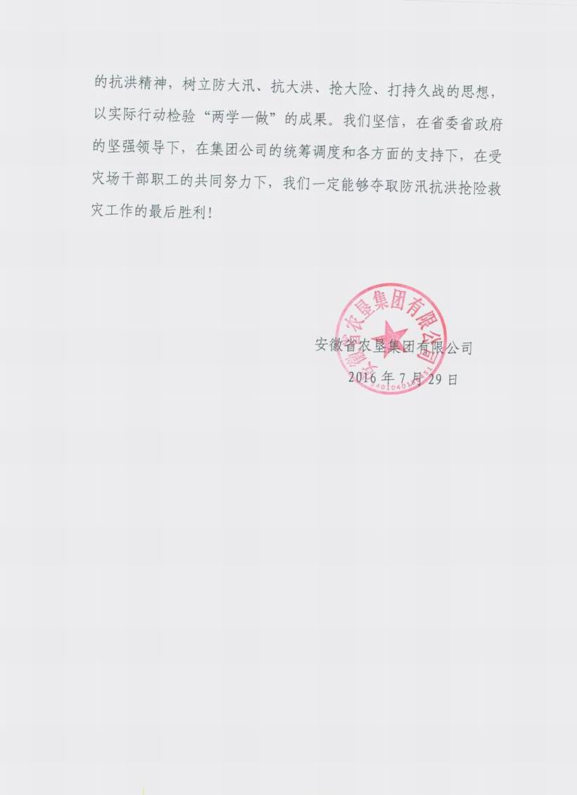 安徽农垦集团致信慰问抗洪一线干群