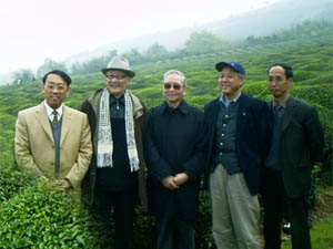 编者按:作者王火(1924-):(图片中者) 为中 国 作协名誉委员、四川省作协名誉副主席。安徽农垦集团60 0余 万字,代表作《战争和人》三部曲曾获第二届国家 图书 奖、第四届茅盾文学奖、炎黄杯人民文学奖及“八 五” 期间优秀长篇小说奖。2003年4月上旬,安徽 省文 联与安徽省敬亭山茶场举办首届“敬亭绿雪”笔 会,研 讨茶文化,游览宣城敬亭山,赏景品茗,又去茔山 考 察。作家王火在茶场即兴写下了“敬亭绿雪”记, 特予 刊载。图片左一为省文联书记处书记、著名书法家 吴 雪,左二为省文联名誉主席、著名作家鲁彦周,右 二为 著名作家、原中国作协副主席、党组书记邓友梅, 右一 为敬亭山茶场场长林启仁。他们兴致勃勃地在敬亭 山茶 场茶园合影留念。