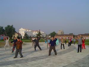 龙亢农场党委经常开展文化活动,丰富职工的业余文 化生活,增强了企业的凝聚力。(图为农场职工在晨 练)