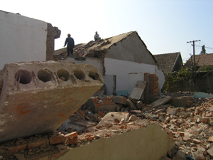 图片说明:潘村湖农场移民建镇工程二、三号楼已 进入扫尾阶段,四、五号楼拟于今年底开工建设。 图为工程位置所在地的原有居民正按照场统一部署 着手房屋拆迁工作。(杨登宏)