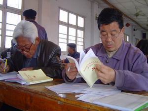图片说明:为检验第一阶段先进性教育活动学习效 果,4月4日上午,龙亢农场党委组织全场618名党员参 加“保持共产党员先进性教育知识测试”。图为老 党员在认真答卷。(邵乃昌)